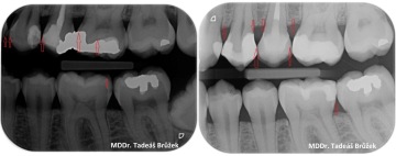 Nahrazení původní nepřesné amalgámové výplně fotokompozitní výplní. Z rentrenového snímku před a po je vidět, že se nejedná pouze o estetickou záležitost. Fotokompozitní výplň umožňuje přesnější ošetření a snižuje pravděpodobnost vzniku dalších zubních kazů u spojení zubu a staré nepřesné výplně.